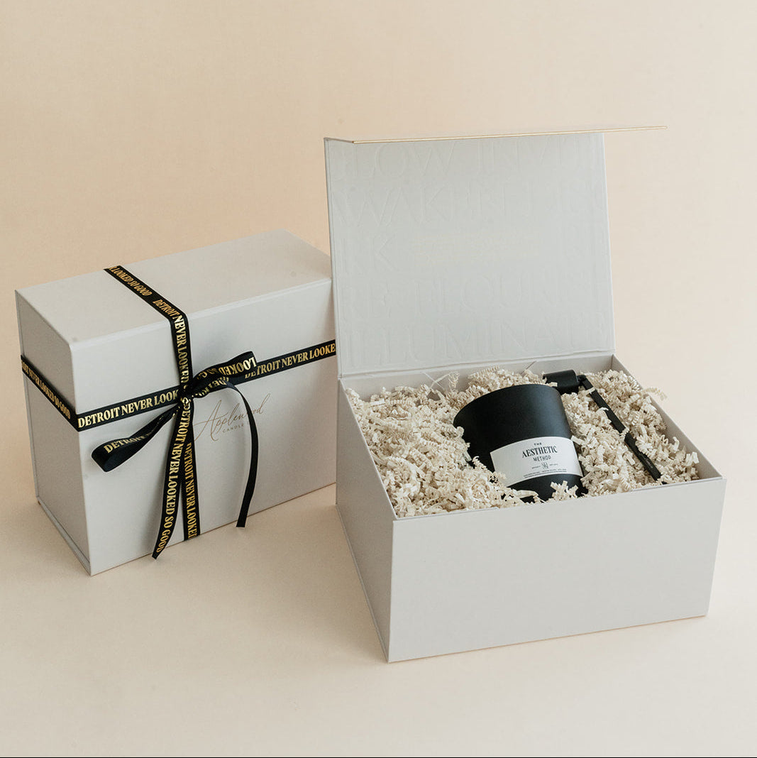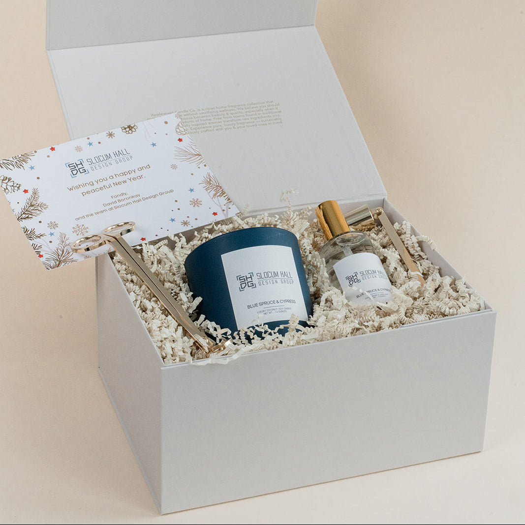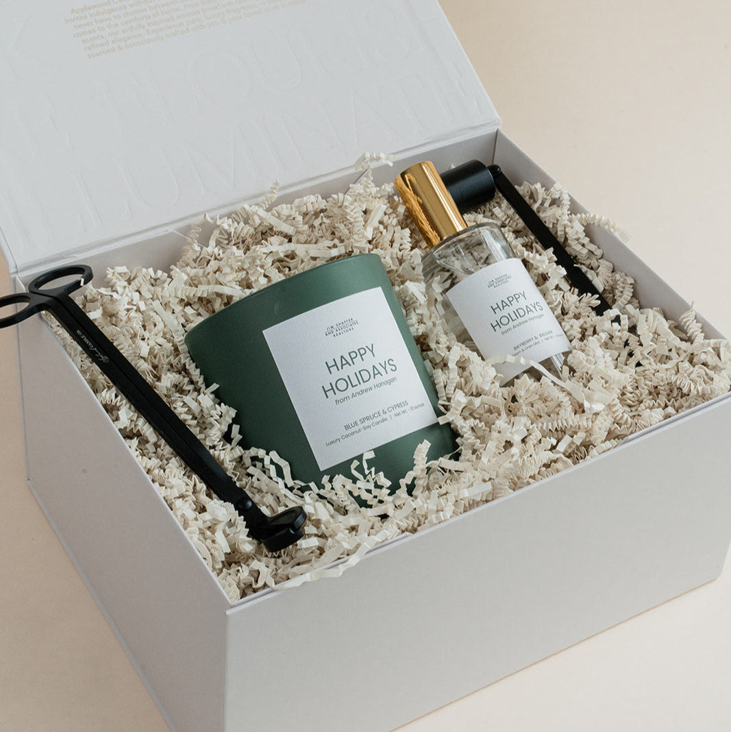 Every aspect of this gift is cohesively branded with a custom ribbon, luxury candle, matching room and linen mist, a matchbox, and your choice of a wick trimmer or snuffer.